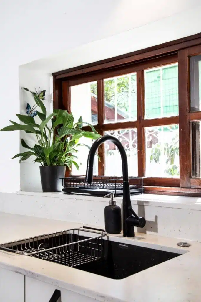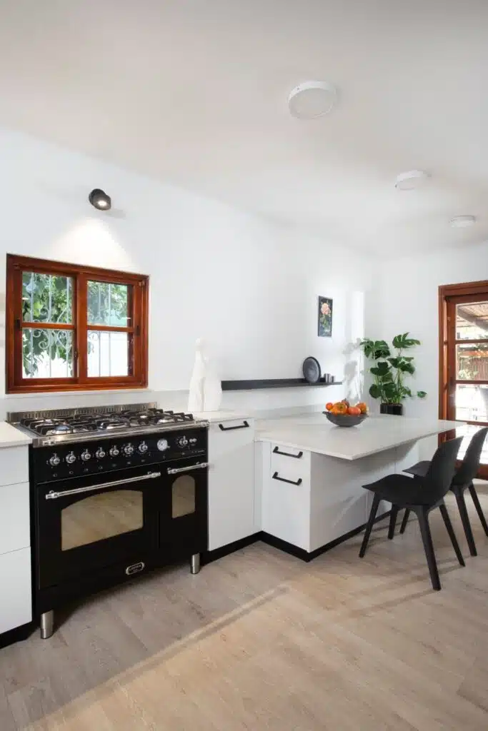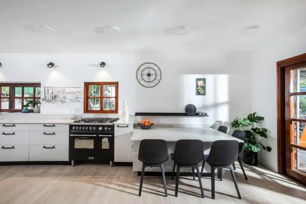 הבחירה בגוון האפרפר ובידיות מתכת מושחרות, קושרת את המטבח הכפרי שתכננה ענבר זינגר, לסגנון האורבני. המפגש שבין ידיות המתכת ובין חלונות העץ, מדגיש חיבור בין סגנונות ויוצר מטבח אקלקטי ומעניין. האלמנט המרכזי במטבח הוא דווקא פינת האוכל הצמודה (שהוא למעשה אי רחב ופרקטי המשמש כפינת אוכל לכל דבר). בניגוד לפינת אוכל רגילה הצד, שפונה למטבח מנוצל לפתרונות אחסון נוספים. פינת האוכל שיצרה רחבה במיוחד ועושה חשק לשבת בה. ממול לפינת האוכל, מערך ארונות מתקרה עד רצפה, שמשמים לאחסון, במרכזם קבועה נישה בתוכה נקבעה פינת קפה.