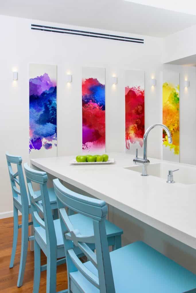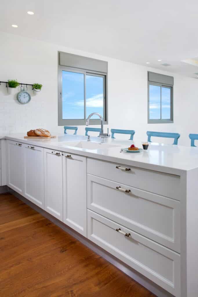 הדירה ממוקמת קו ראשון לים, לכן בתכנון היה חשוב לתת לנוף את הבמה ולייצר אזכורים שונים בדירה בנגיעות הצבע ובתנועתיות. המטבח נמצא בopen space- עם פינת האוכל והסלון, כך שנוכחותו העיצובית היתה חשובה ביותר. בחרנו לעצב מטבח פתוח כך שניתן יהיה ליהנות מהנוף בזמן הבישול, שכן הזוג אוהב לבשל.
